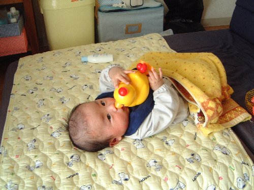 写真は、アヒル隊長と格闘中の誠也くんです。